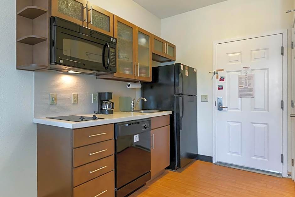 This room features a kitchenette with kitchenware, a 32-inch flat-screen TV, a recliner, one queen bed, dining table with chairs and a bathroom.